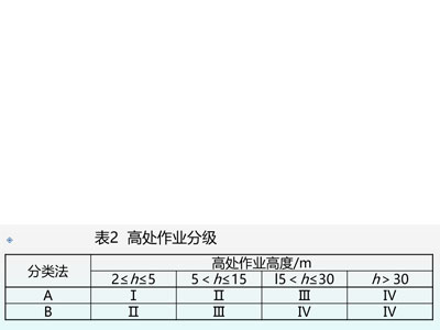 三.不存在列出的任一種客觀危險因素的高處作業(yè)按表2規(guī)定的A類法分級,存在列出的一種或一種以上客觀危險因素的高處作業(yè)按表2規(guī)定的B類法分級。