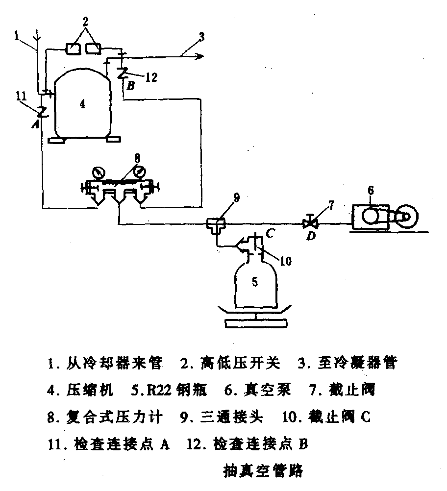 操作方法是:首先使制冷系統(tǒng)抽到一定真空度后,充人20克左右制冷劑,啟動制冷壓縮機(jī)運(yùn)轉(zhuǎn)數(shù)分鐘,使制冷系統(tǒng)內(nèi)的殘留空氣與制冷劑混合。然后對制冷系統(tǒng)進(jìn)行第二次抽真空,使制冷系統(tǒng)內(nèi)殘留的是制冷劑和空氣的混合氣體,從而達(dá)到減少制冷系統(tǒng)內(nèi)殘留空氣的目的。