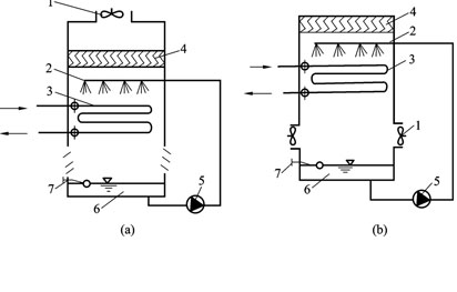◆原理:冷卻水噴淋時蒸發(fā)吸熱,吸收高壓制冷劑蒸汽的熱量,同時使空氣從下向上在水膜表面吹過。