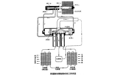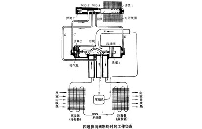 工作原理:利用閥通道的變換來改變系統(tǒng)內(nèi)制冷劑的流動方向,從而達到系統(tǒng)正、逆循環(huán)的切換。