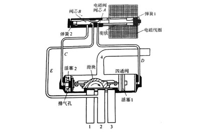 主閥的管口4連接于壓縮機高壓排氣口,管口2連接于壓縮機低壓吸氣口。1、3兩個管口分別連接室內(nèi)、室外熱交換器。